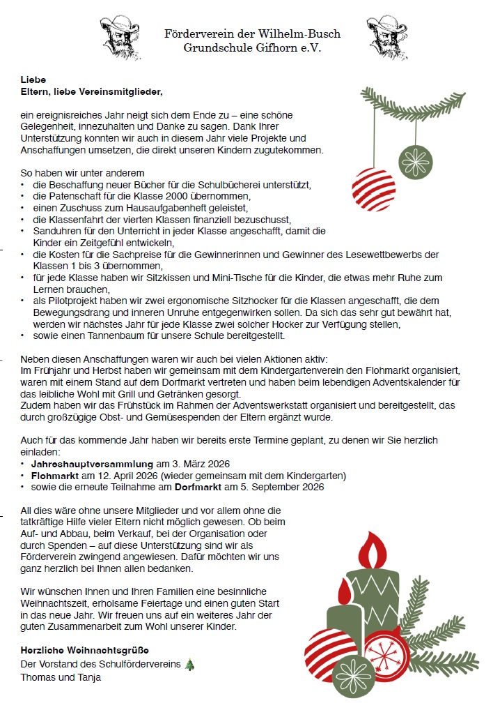 An dieser Stelle möchten wir noch einmal einige Worte des Dankes loswerden. Zum einen an den Förderverein, der vor Allem im Rahmen des lebendigen Adventskalenders und der Adventswerkstatt für das leibliche Wohl gesorgt hat. Aber auch an die Elternhelfer, die während des gemeinsamen Bastelns mit kleinen Projekten unterstützt und so einen großen Beitrag zu einer tollen Atmosphäre geleistet haben. Dank geht auch an unseren Hausmeister Herrn Stalinski, der bei sämtlichen Aktionen als gute Seele im Hintergrund unermüdlich gearbeitet und so für einen immer reibungslosen Ablauf gesorgt hat. Wir freuen uns schon auf die nächste, gemeinsame Adventszeit.